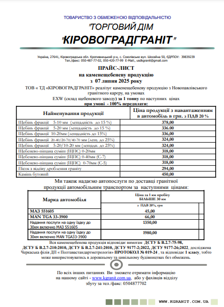 на умовах EXW (склад щебеневого заводу) за 1 тонну